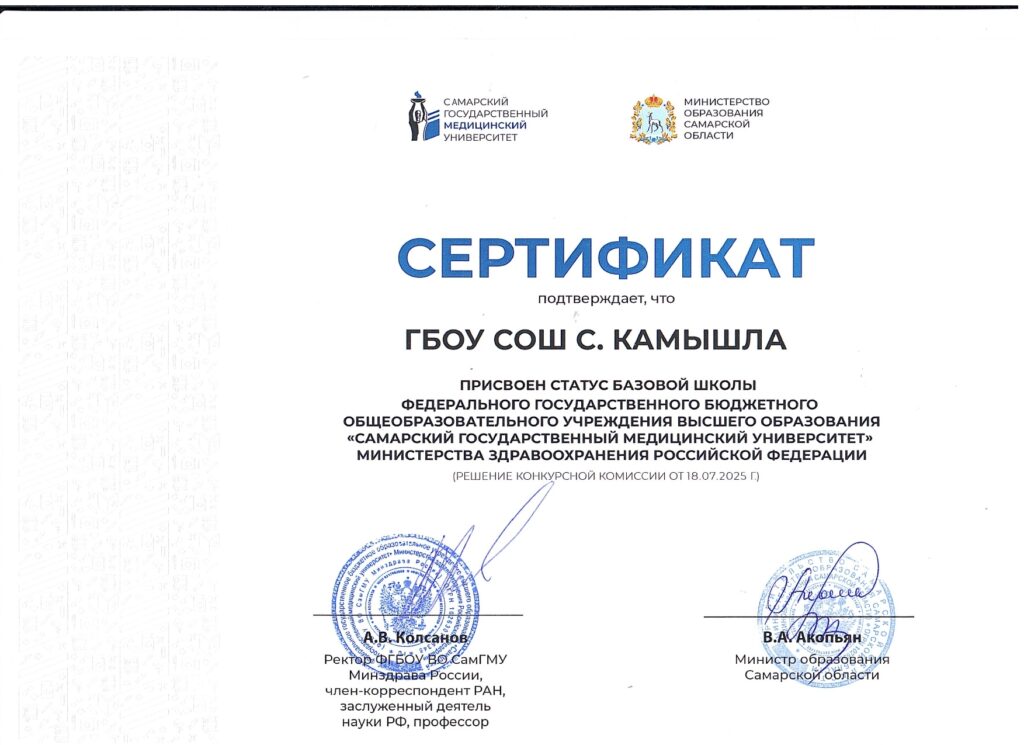 ГБОУ СОШ с.Камышла имеет статус “Базовой школы СамГМУ” с 1 сентября 2025 года.